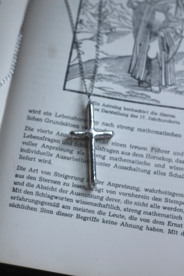クロスのペンダント クロスの形を立体的につくりました 正面からはガラスが見えませんが 横から見ると光沢のあるガラスがキラッと光を受け止めます * 金具の色:銀色 * クロスの大きさ:縦約5.2㎝×横約2.6㎝ 厚み約1.1cm * チェーンの長さ:約70㎝(短く変更できます) * 金属アレルギー対応をしておりませんので金属アレルギーの方はご使用をお避けください。 ひとつひとつ手づくりです。写真のものと個体差があります。 既製品のような完璧な仕上がりではありません。 多少のサイズの誤差、ゆがみ、ガラスの模様の違い等ご理解頂いた上でご注文をお願い致します。 完璧をお求めの方、細かな所を気にされる方は 申し訳ございませんがご注文をお見合わせ下さい。 どうぞご理解・ご了承の上、ご検討下さい。 お使いのモニターによっては実際の色と多少違うことがあります。 気になる点がございましたら、お気軽にご質問下さい。